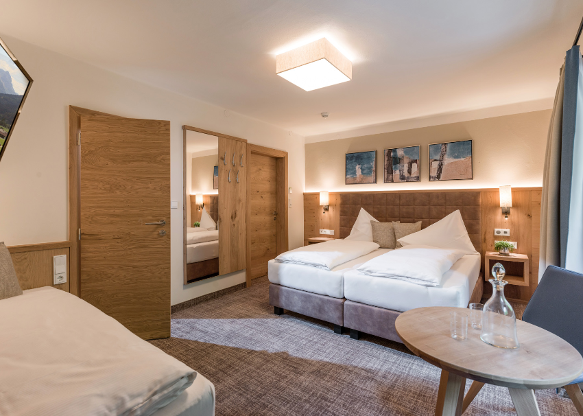 We offer Double, Triple and Quad rooms ‘Berg Gluck’ which are from 20m2 to 28m2 in size. All 28 ensuite rooms have a comfortable, modern Alpine feel and feature TV, free WiFi, hairdryer, minibar fridge (not stocked), shower/bath, WC.