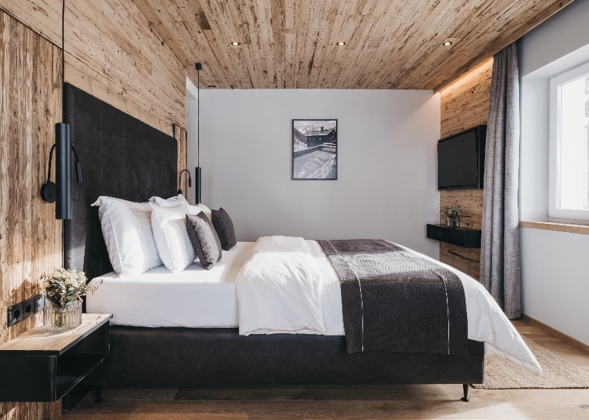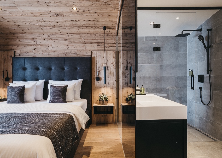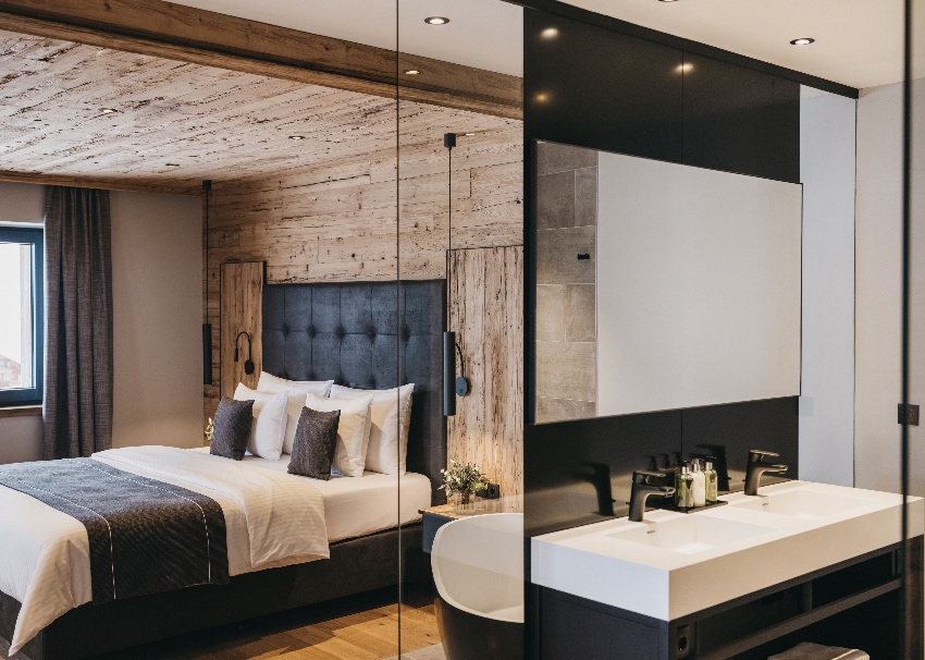 Standard Double rooms are around 23m2 without balcony and similar sized Superior Double rooms (20m2) enjoy a balcony or terrace. Deluxe double rooms are slightly larger (22m2) again with balcony or terrace. Larger Grand Deluxe rooms (25m2) offer a free-standing bathtub in addition to the bathroom and balcony or terrace with mountain views.